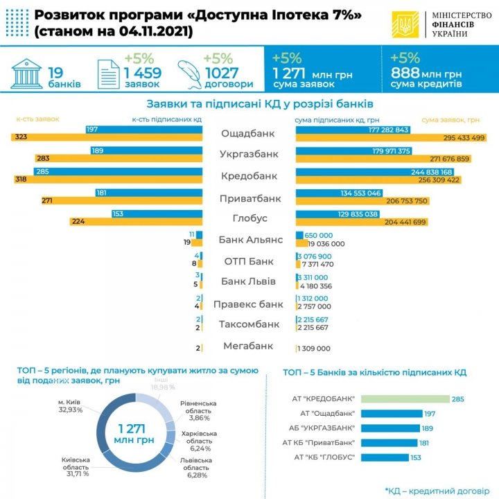 В рамках госпрограммы «Доступная ипотека 7%» уполномоченные банки по состоянию на 4 ноября выдали 1027 кредитов на общую сумму 888,04 млн грн.