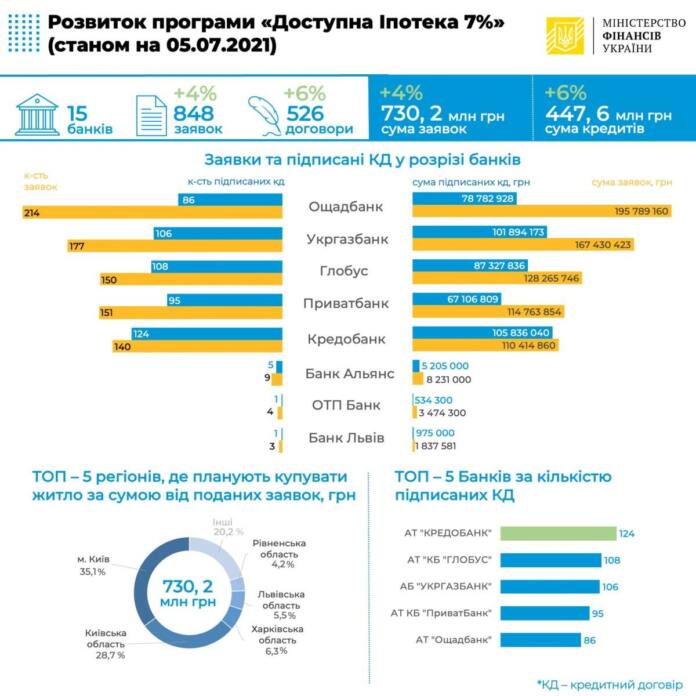 Уполномоченные банки в рамках программы «Доступная ипотека 7%» по состоянию на 5 июля подписали 526 кредитных договоров на общую сумму 447,6 млн грн, на первичном рынке — 21,74%, на вторичном — 78,26% соответственно.