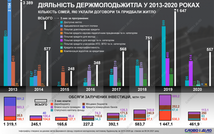 В 2019 году Госмолодежьжилье заключило договоры с 1647 семьями. Общий объем инвестиций составил 1 млрд 447,1 млн грн: из уставного капитала Фонда – 67,4 млн, из госбюджета – 538,3 млн, из местных бюджетов – 252,2 млн, собственные средства граждан – 589,2 млн.