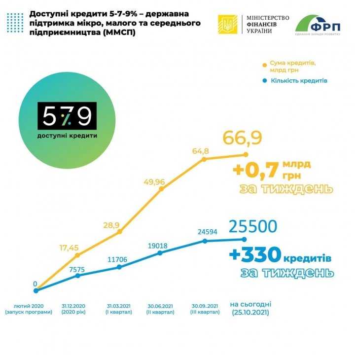 Finance.ua как портал, который заботится о ваших сбережениях, узнал от Министерства финансов, что всего же с момента старта «5−7-9%» представители микро-, малого и среднего предпринимательства (ММСП) получили от уполномоченных банков 25,5 тыс. кредитов на сумму 66,9 млрд грн.