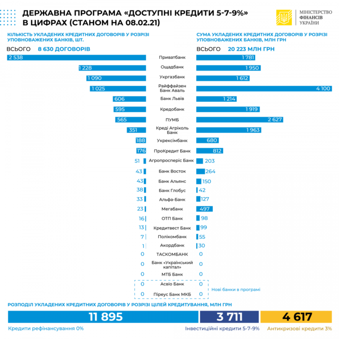 С момента старта программы «Доступные кредиты 5-7-9%» уполномоченные банки уже выдали 8630 займов на общую сумму в 20,2 миллиарда гривен.