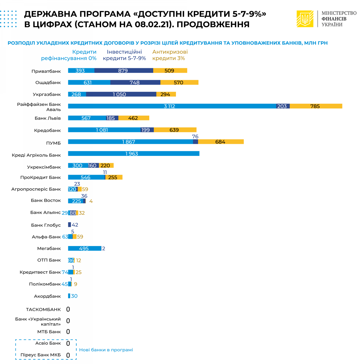Из них 11,894 миллиарда гривен были выданы в качестве рефинансирования предварительно полученных займов, 3,711 миллиарда предприниматели получили на капитальные инвестиции и 4,617 миллиарда гривен в качестве антикризисных кредитов под 3%.