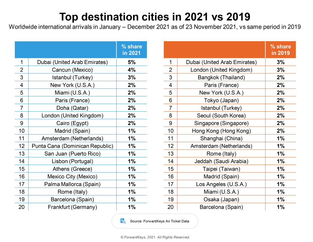 Топ-10 этого года выглядит так (с 1-го по 10-е место): Дубай (ОАЭ), Канкун (Мексика), Стамбул (Турция), Нью-Йорк (США), Майами (США), Париж (Франция), Доха (Катар), Лондон (Великобритания), Каир (Египет), Мадрид (Испания).