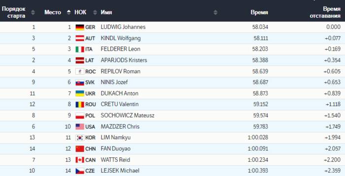 Украинец показал 7-е время из 14-ти участников – его результат составил 58.873 секунды, а его отставание от лидера Йоханнеса Людвига из Германии – 0.839. Максимальная скорость, показанная Антоном на дистанции, составила 124,9 км/ч.