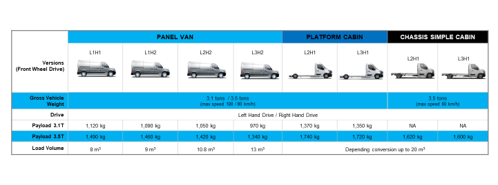 Это шасси с кабиной, которое доступно в двух исполнениях по длине (L2 и L3), с максимальной полезной нагрузкой 1620 кг (до переоборудования).