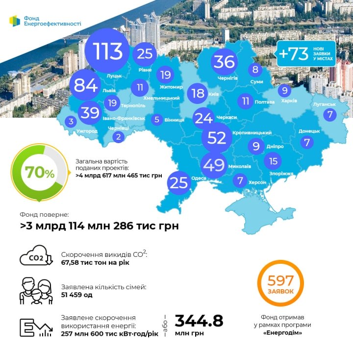 Согласно сообщению, ведущие позиции по количеству поданных заявок занимают Волынская (113), Львовская (84) и Кировоградская (52) области. Всего уже более 51,4 тыс. семей стали участниками программы «Энергодом». Экономия энергии в случае реализации всех проектов оценивается в 257,6 млн кВт-ч/год или 344,8 млн грн/год.