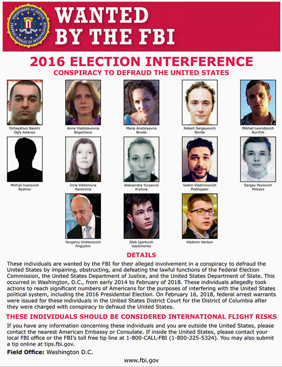 В сообщении спецслужбы утверждается, что Пригожин разыскивается за предполагаемую причастность к заговору против США с целью воспрепятствования работе Федеральной избирательной комиссии США. По версии ФБР, бизнесмен был главным спонсором «Агентства интернет-исследований» (IRA) и лично одобрил вмешательство структуры в американские выборы.