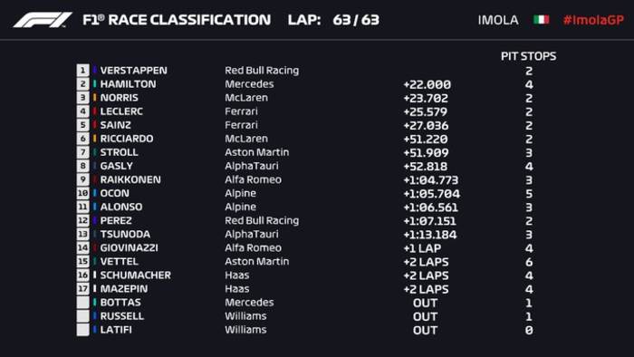 Кругов за 15 до финиша ситуация сложилась следующим образом – Ферстаппен далеко впереди, Норрис за стертых шинах сдерживал два Феррари, к которым подобрался Хэмилтон. Поочередно Льюис разобрался со всеми конкурентами – Норрис сдался всего за 3 круга до финиша.