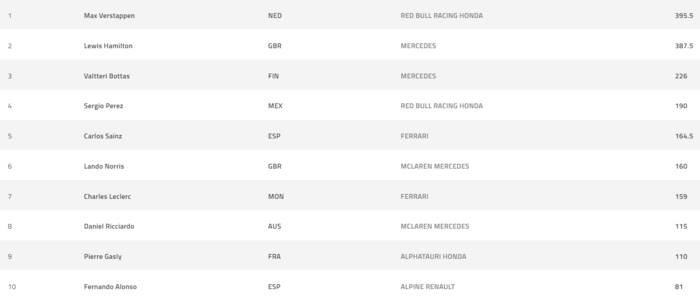 Благодаря финишу на третьем место Карлос Сайн опередил и Ландо Норриса, и Шарля Леклера в борьбе за пятое место в личном зачете пилотов.