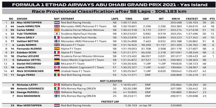 Сэйфти кар уехал с трассы перед последним кругом, Ферстаппен был уже позади Хэмилтона, поскольку круговые вернулись в конец пелотона. Как только гонка возобновилась, нидерландец на свежих шинах обошел британца и вырвал победу в гонке и в чемпионате в целом.