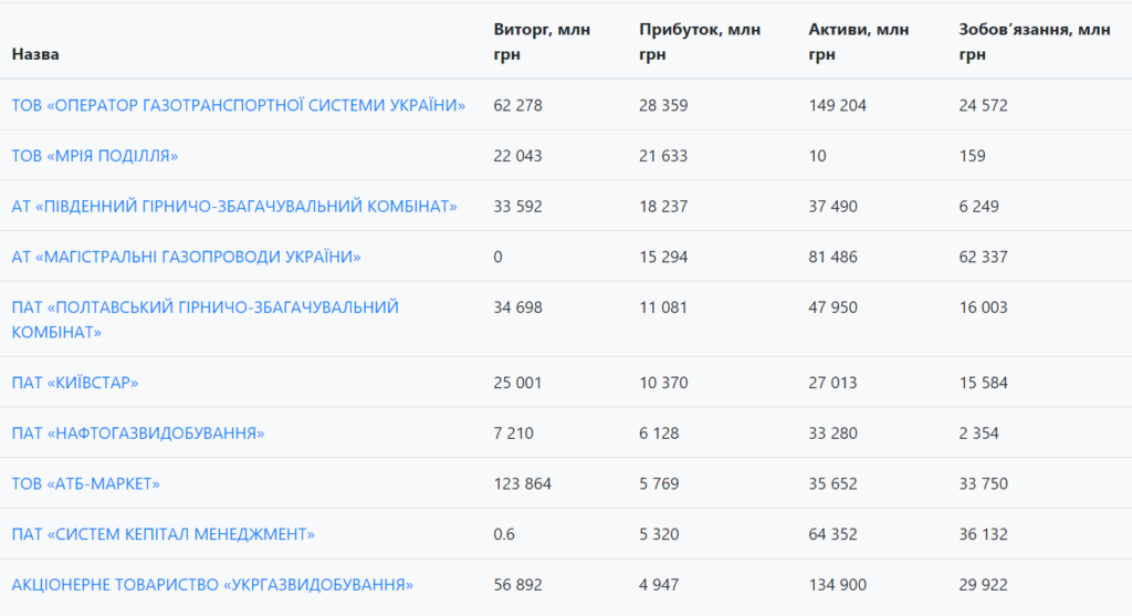 ООО «Оператор газотранспортной системы Украины», агрокомпания ООО «Мрия Подилля» и АО «Южный горно-обогатительный комбинат» стали самыми успешными компаниями в 2020 году.
