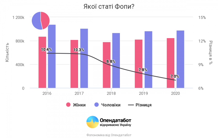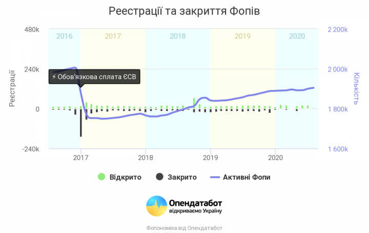 В 2016 году мы наблюдали за закрытием “спящих ФЛП”, но сейчас Украина почти вернулась к пиковому показателю по количеству предпринимателей. На данный момент в Украине зарегистрировано 1 891 200 ФЛП.