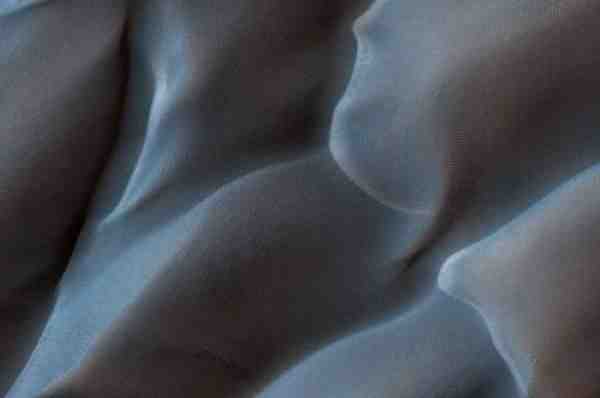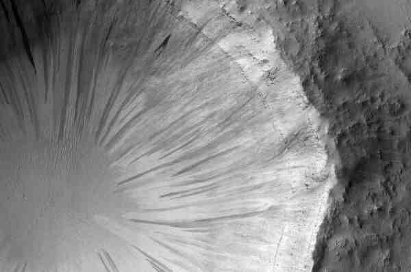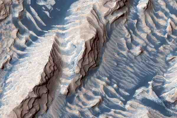 Осадочные породы и песок в кратере Дэниэльсон на Марсе.