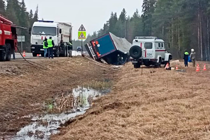 Водитель фуры, перевозившей 22 тонны соляной кислоты, потерял сознание за рулем во время движения по трассе в Архангельской области. В результате машина съехала в кювет и перевернулась, содержимое одной из 250-литровых бочек вылилось на землю, сообщает РЕН ТВ.