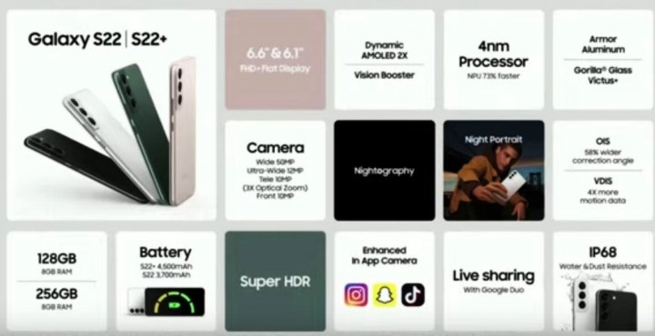 В смартфонах 4 нанометровые процессоры. Батареи: на 3,700 mAh в Galaxy S22, и на 4,500 mAh в Galaxy S22+. Корпус смартфонов защищен от влаги по стандарту IP68.