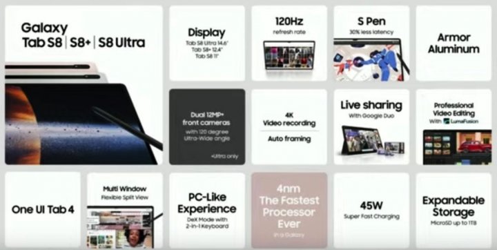 Компания представила серию планшетов Galaxy Tab S8 (Galaxy Tab S8 | S8+ | S8 Ultra) на Android. Планшеты отличаются минималистичным дизайном с тонким металлическим корпусом (от 5,5 до 6,3 мм) и очень узкими рамками экрана.
