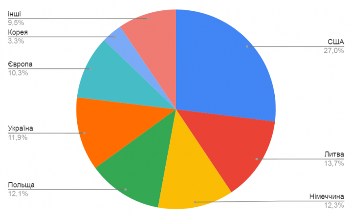 В целом США, Литва, Германия – лидеры по интересу к подержанных авто. Вместе они собирают 53% всего спроса с указанием геофактора (в среднем около 300 тыс. запросов в месяц).