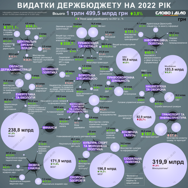 В Госбюджете-2022 предусмотрели больше средств на НАБУ, НАЗК и Бюро экономической безопасности. Расходы на Министерство инфраструктуры увеличили до 26,8 млрд грн – на 187,6%.