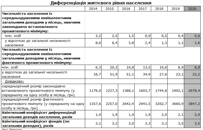 В 2020 году доходы ниже законодательно установленного прожиточного минимума получали 0,6 млн (1,6%) граждан Украины, что больше, чем в 2019 году (0,4 млн человек, 1,1%). Размер минимума составил 2078,4 гривен в месяц.