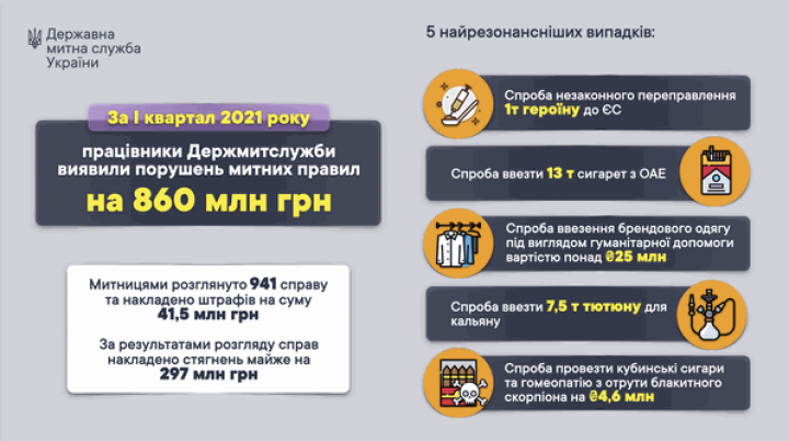 Государственная таможенная служба (ГТС) выявила нарушения таможенных правил на почти 860 млн грн в первом квартале 2021 года.