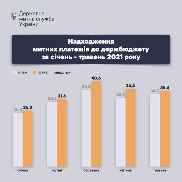При этом в мае 2021 года Государственная таможенная служба перечислила в бюджет Украины 35,4 млрд грн (при запланированных 34 млрд грн) и выполнила план на 104%.