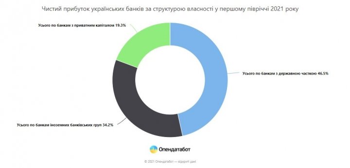 По распределению чистой прибыли банковский сектор Украины по состоянию на первое полугодие 2021 выглядит следующим образом: 46% — государственные банки, 34% — банки иностранных групп, 19% — отечественные банки с частным капиталом.