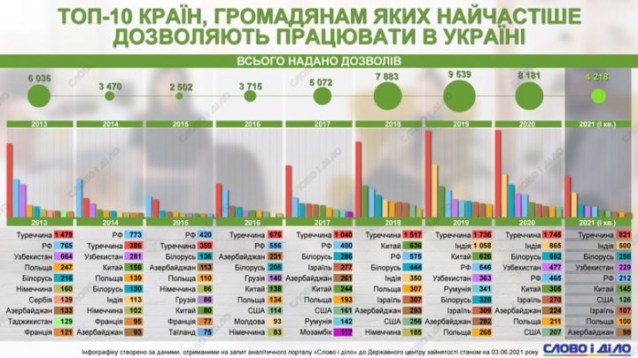Портал «Слово и дело» проанализировал, сколько разрешений на работу с 2013 года выдала Украина и граждане каких стран чаще всего хотят работать у нас.