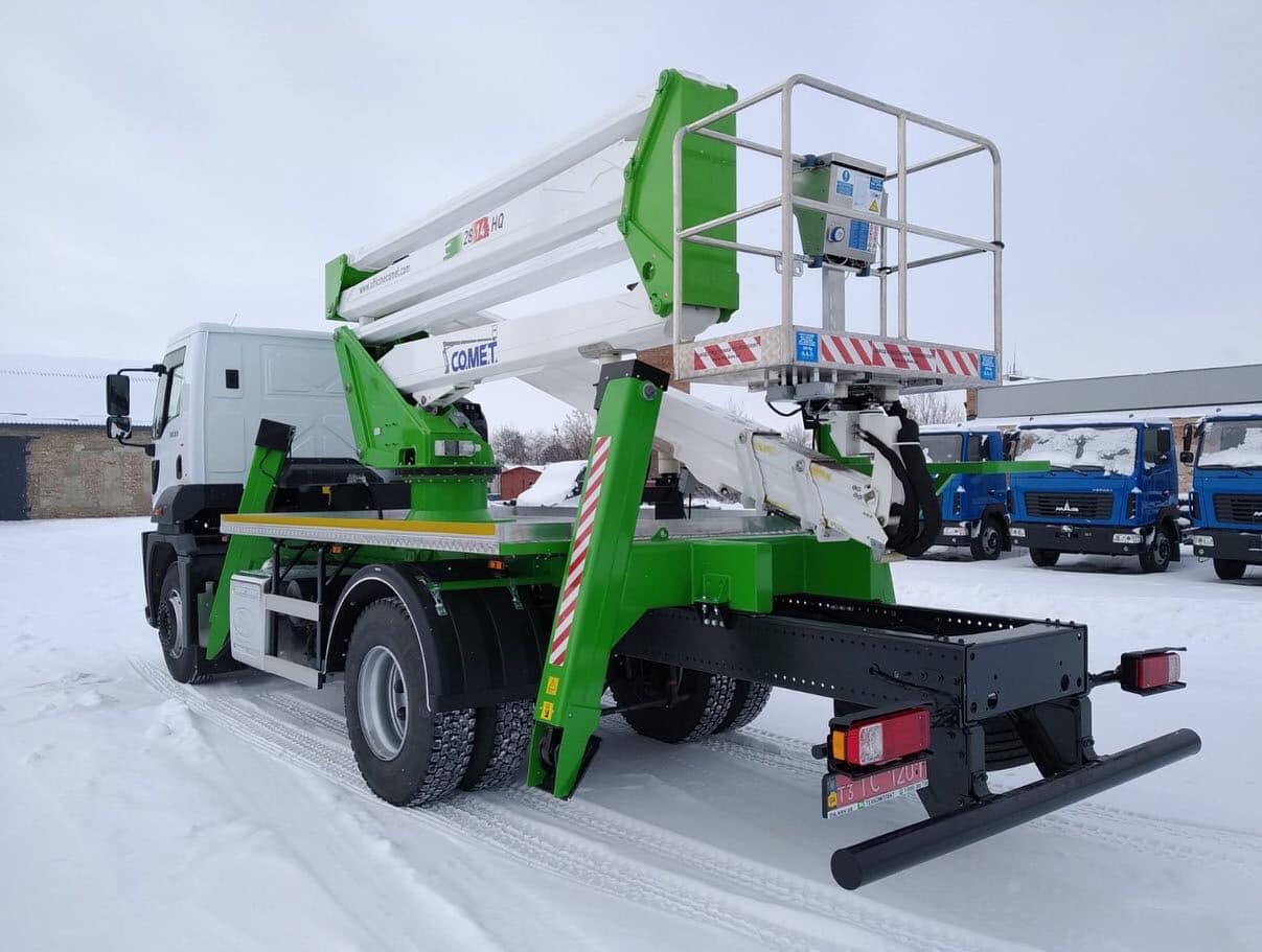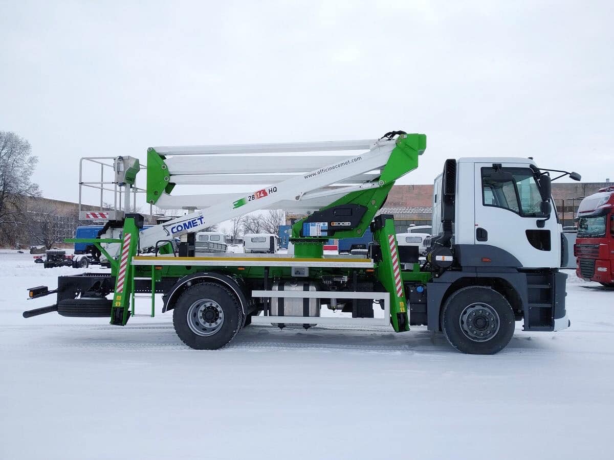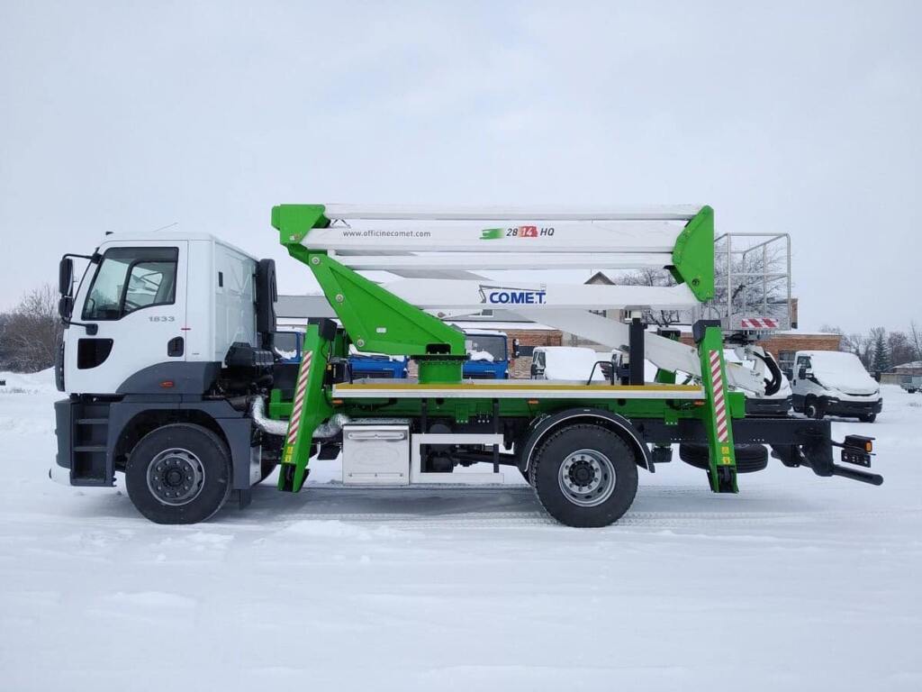 Что же касается автовышки Comet 28/ 2/ 14 HQ, то она обладает максимальной рабочей высотой 28 м и максимальным вылетом 14 м. Грузоподъемность люльки – 250 кг. Наземная часть может вращаться на 360 градусов. Навесное оборудование выполнено из высокопрочной стали, что обеспечивает максимальную жесткость стрелы, а значит – максимальную безопасность при работе.