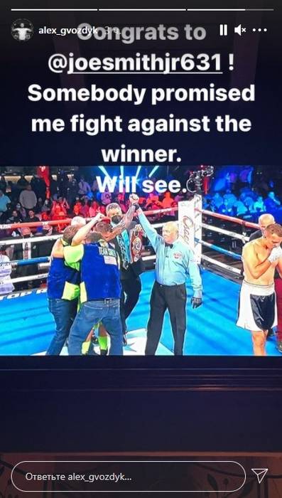 Украинский боксер в Instagram-stories опубликовал фотографию, на которой он поздравил Джо Смита-младшего (26-3, 21 КО) с победой над Максимом Власовым (45-3, 26 КО) в чемпионском бою.