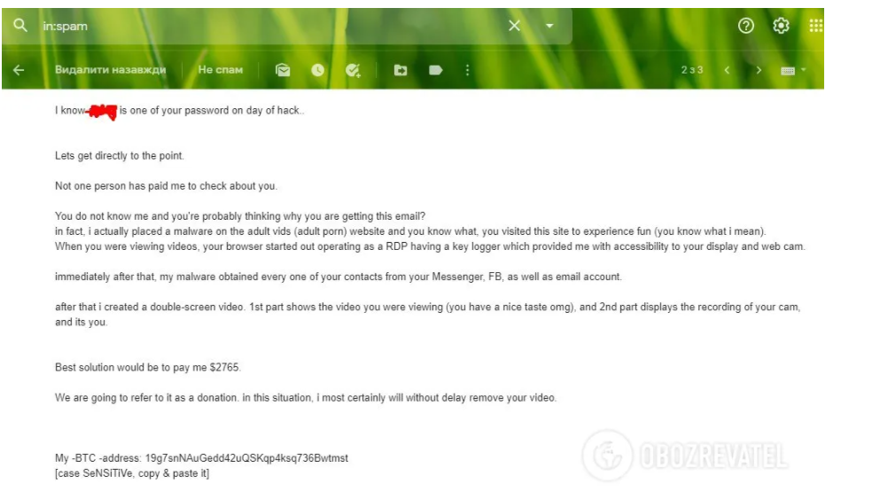 Пример. Жертвой атаки мошенников стала и киевлянка Леся. Сначала она получила письмо от неизвестно отправителя на английском языке. В письме указали пароль, который она часто использует в различных аккаунтах, и угрожали. Якобы хакеры взломали ее компьютер, когда она заходила на сайты “для взрослых”, получили доступ к ее камере и записали все ее действия на видео.