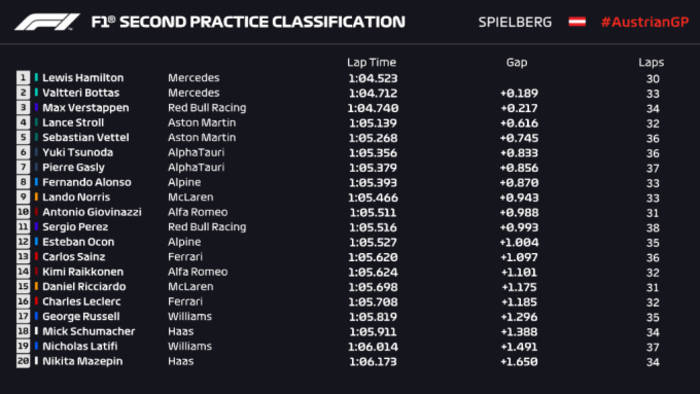 А вот во второй практике лучшими были уже пилоты Мерседеса, которым удалось опередить Ферстаппена. При этом время Хэмилтона было лучшим по итогам двух практик.