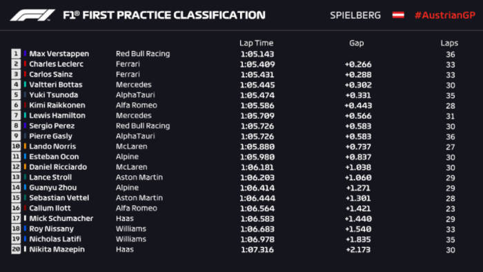 В первой практике лучшим был лидер сезона Макс Ферстаппен на Ред Булле, за которым были пилоты Феррари.