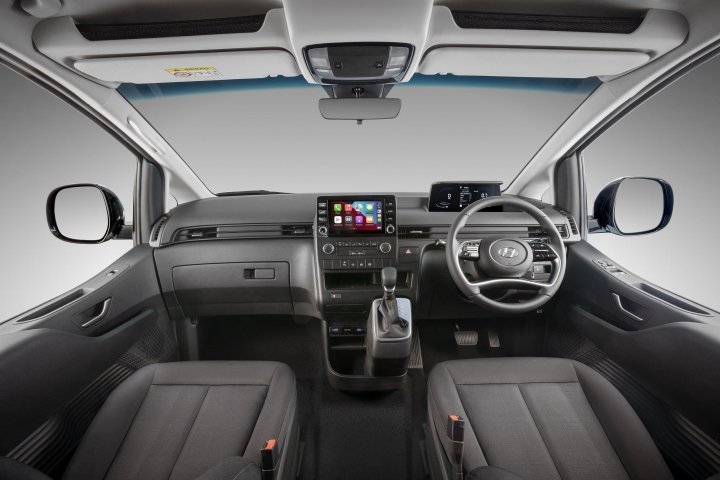 Hyundai Staria-Load поставляется с 17-дюймовыми стальными колесами, фарами с датчиком света, входом без ключа, дистанционным открыванием и закрыванием окон, подогревом и складыванием боковых зеркал, 4,2-дюймовым экраном для приборов и 8-дюймовым экраном информационно-развлекательной системы, протоколами беспроводного соединения Apple CarPlay и Android Auto, Bluetooth, “кожаным” рулем и ручкой переключения передач, текстильной обивкой кресел.
