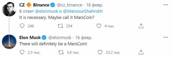 Глава компаний Tesla и SpaceX Илон Маск захотел создать марскоин (MarsCoin). Он написал об этом в Twitter.