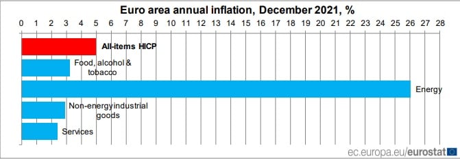 Годовая инфляция в зоне евро ускорилась с 4,9% в ноябре до 5% в декабре и достигла нового исторического максимума.