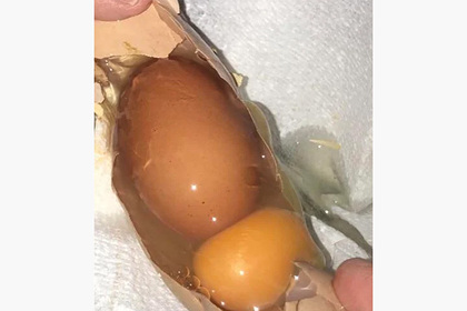 На снимке видно, что под скорлупой обычного на первый взгляд яйца прячется не только желток, но и еще одно яйцо в скорлупе. Комментаторы отметили, что подобные «сюрпризы» случаются крайне редко. По словам одного из них, за 15 лет выращивания цыплят он ни разу не видел ничего подобного.