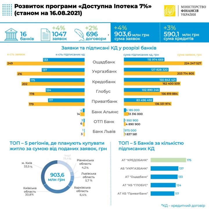 По состоянию на 16 августа уполномоченные банки подписали 696 кредитных соглашений на 590,14 млн грн в рамках госпрограммы «Доступная ипотека 7%».