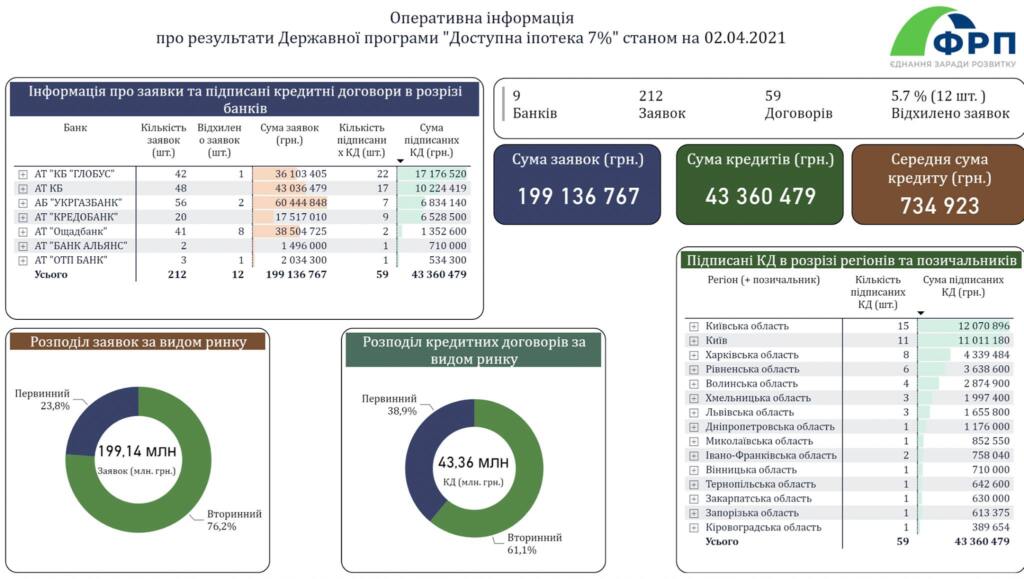 За первый месяц действия программы “Доступная ипотека 7%” банки подписали 59 договоров на 43 млн грн – в целом за этот период банки получили 212 заявок.