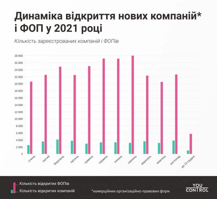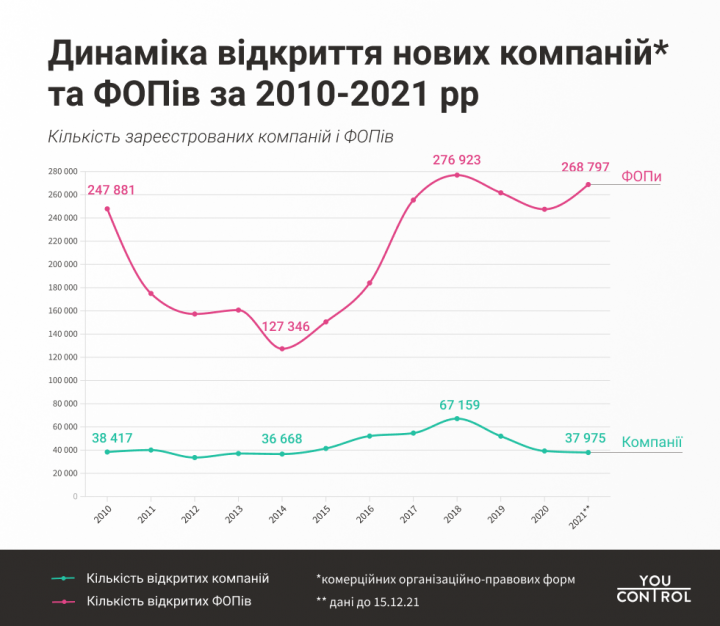 если в прошлом году количество вновь созданных не превышало 247 518 физических лиц предпринимателей (ФЛП), то по состоянию на 15 декабря 2021 года было открыто 268 797 новых ФЛП. Что касается компаний, то количество открытых за год снизилось с почти 39,5 тыс. до 38 тыс.