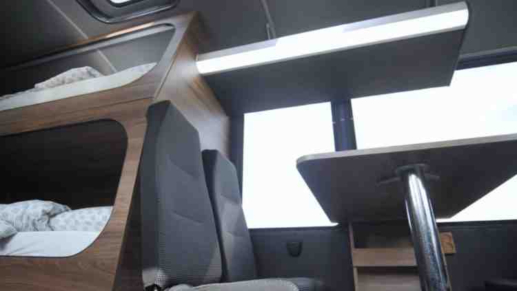 Внутри домика есть обеденная и кухонная зоны, два спальных места, туалет, душ и разные отсеки для хранения вещей.