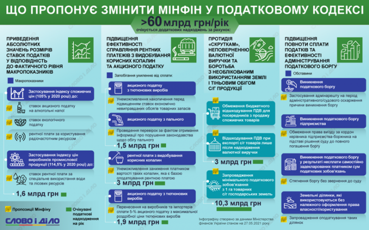 Кабинет министров 12 мая утвердил проект изменений в Налоговый кодекс. По словам премьера Дениса Шмыгаля, принятие данного законопроекта увеличит ежегодные поступления в госбюджет на 60 млрд грн. При этом изменения не коснутся ФЛПов, малого и среднего бизнеса, а только крупных предпринимателей.