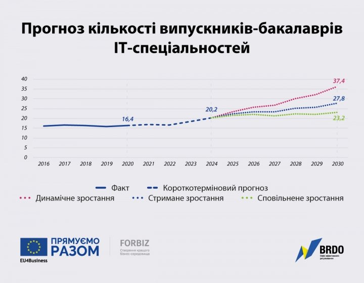 В ближайшие годы количество выпускников-бакалавров IT-специальностей в украинских вузах вырастет – в 2024 году диплом бакалавра получат более 20 тысяч человек в сфере IT, это на 23% больше, чем в 2020 году.