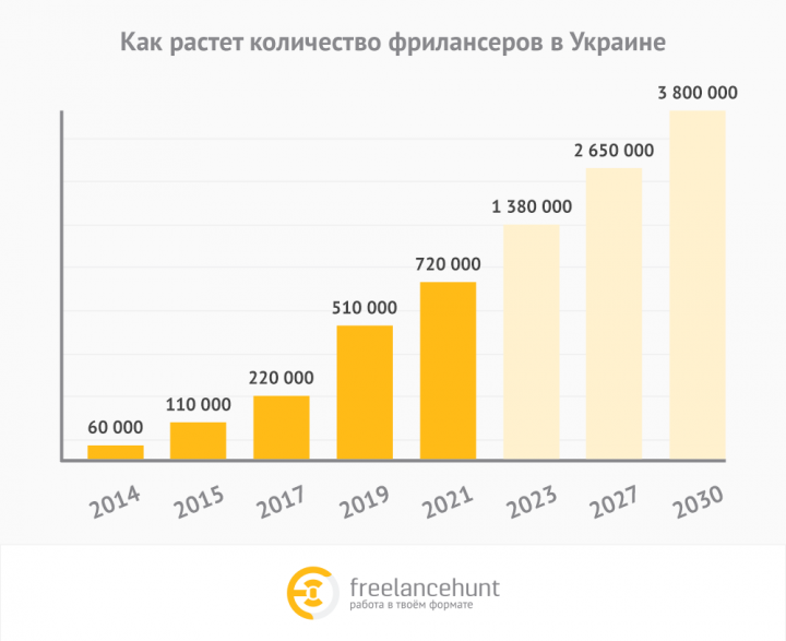 при сохранении динамики, к 2030 году количество фрилансеров может приблизиться к 4 миллионам, что составит 16% работоспособного населения страны. В итоге каждый шестой украинец будет работать в формате самостоятельной занятости.
