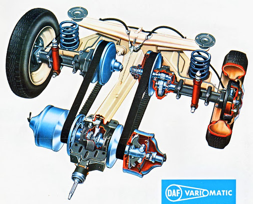 Первая легковая модель – DAF 600 произвела сенсацию. Дело в том, что она имела совершенно необычную автоматическую трансмиссию Variomatic – бесступенчатою, клиноременную. Передаточное число там плавно варьировалось за счет изменения диаметров шкивов. Они приводились в действие длинными ремнями, за которые машину шутливо называли «автомобиль на подтяжках».