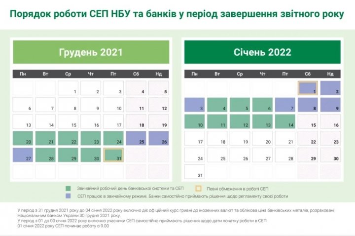 31 декабря 2021 года до 13.00 через СЭП могут проводиться только платежи между банковскими учреждениями, подчиненными одному юридическому лицу, а также платежи от участников СЭП в Национальный банк и органы Государственной казначейской службы и платежи от Национального банка и органов Государственной казначейской службы в адрес всех участников СЭП. Валютный рынок Украины работает с учетом особенностей работы СЭП, определенных в регламенте. Банковский день в СЭП заканчивается в 13.00;