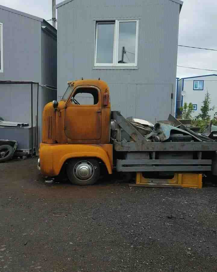 Этот необычного вида эвакуатор издалека напоминает американские грузовики конца 40-хх гг с «коротконосой» кабиной над двигателем – COE (Cab Overs Engine). Например, у Сhevrolet модели c таким дизайном назывались