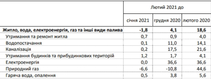 Средние цены на жилье, воду, электроэнергию, газ и другие виды топлива в Украине за февраль 2021 года снизились на 1,8%. При этом за последний год (по сравнению с февралем прошлого года) тарифы поднялись на 18,6%.