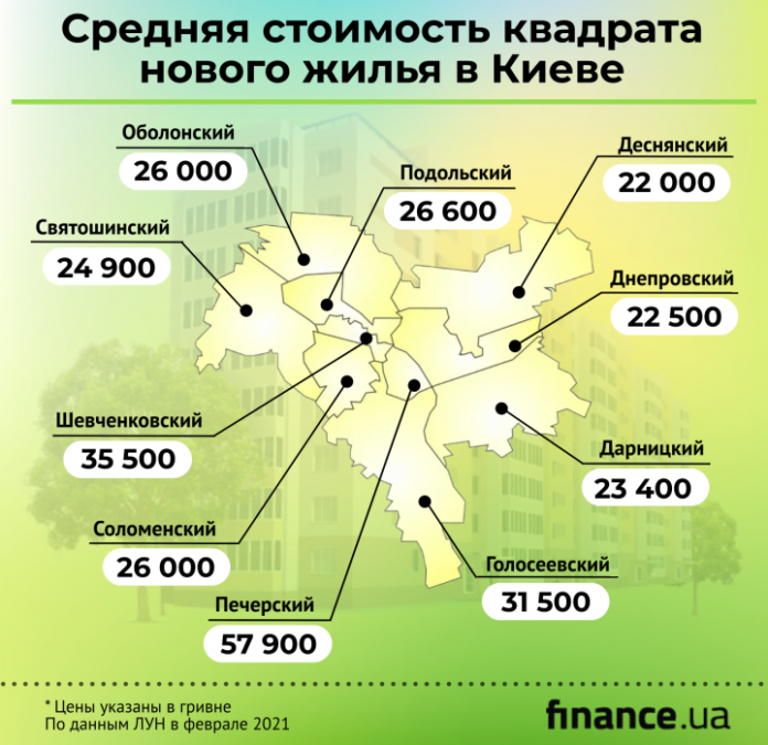 в тройке районов с самыми дорогими квартирами в новостройках лидером остается Печерский — здесь средняя цена в феврале достигла 57 900 грн/кв. м. За ним следуют Шевченковский (35 500 грн/кв. м) и Голосеевский (31 500 грн/кв. м);