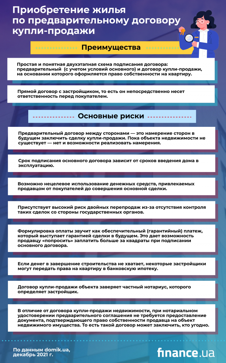 В чем нюанс? Предварительный договор купли-продажи не есть основанием для перехода права собственности на объект недвижимости к покупателю квартиры и для обращения в суд с иском для признания права собственности. Как отмечают эксперты, предварительный договор можно назвать договором о намерении. Пока физически объект недвижимости не существует, любые договоренности могут остаться на бумаге. Реальных юридических механизмов, способных защитить права покупателя в схеме с предварительными договорами, нет.