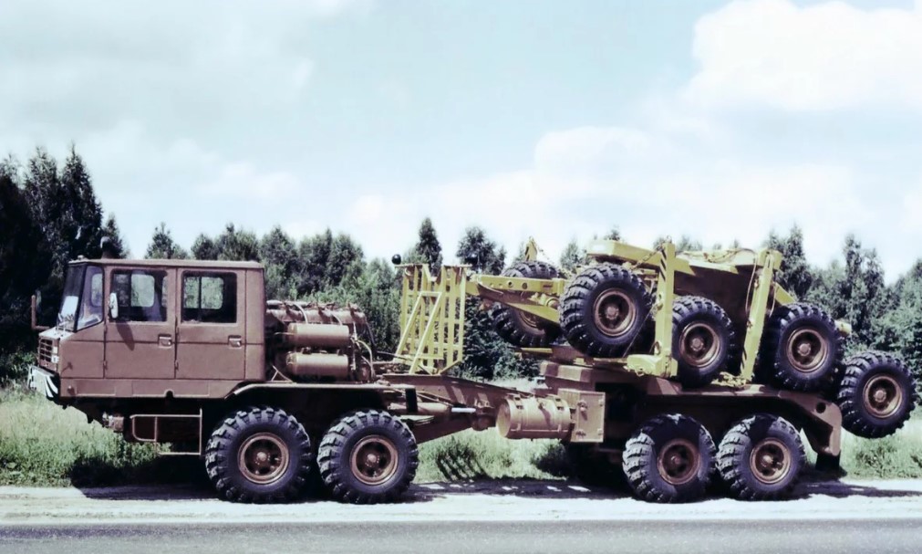 Двигатель ЯМЗ-240Н (V12) развивал 400 л. с., а трансмиссия была гидромеханическая. Машина явно предназначалась для военных, но чем-то им не понравилась. Вот и было решено попробовать возить на ней не ракеты, а бревна – с прицепом-роспуском в составе автопоезда полной массой 72 т. Но и здесь дело дальше не пошло.